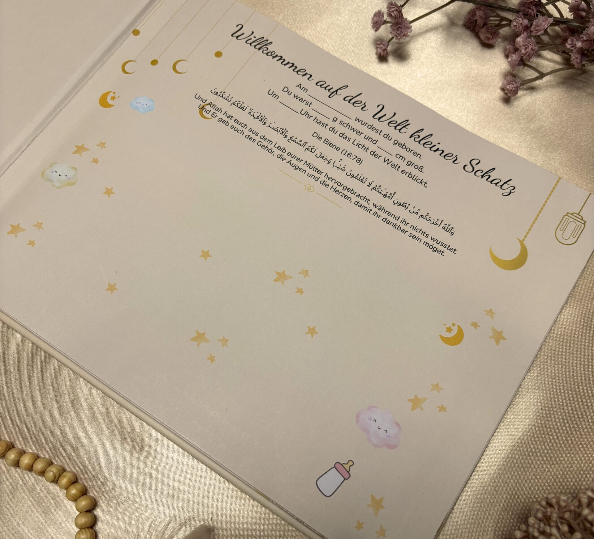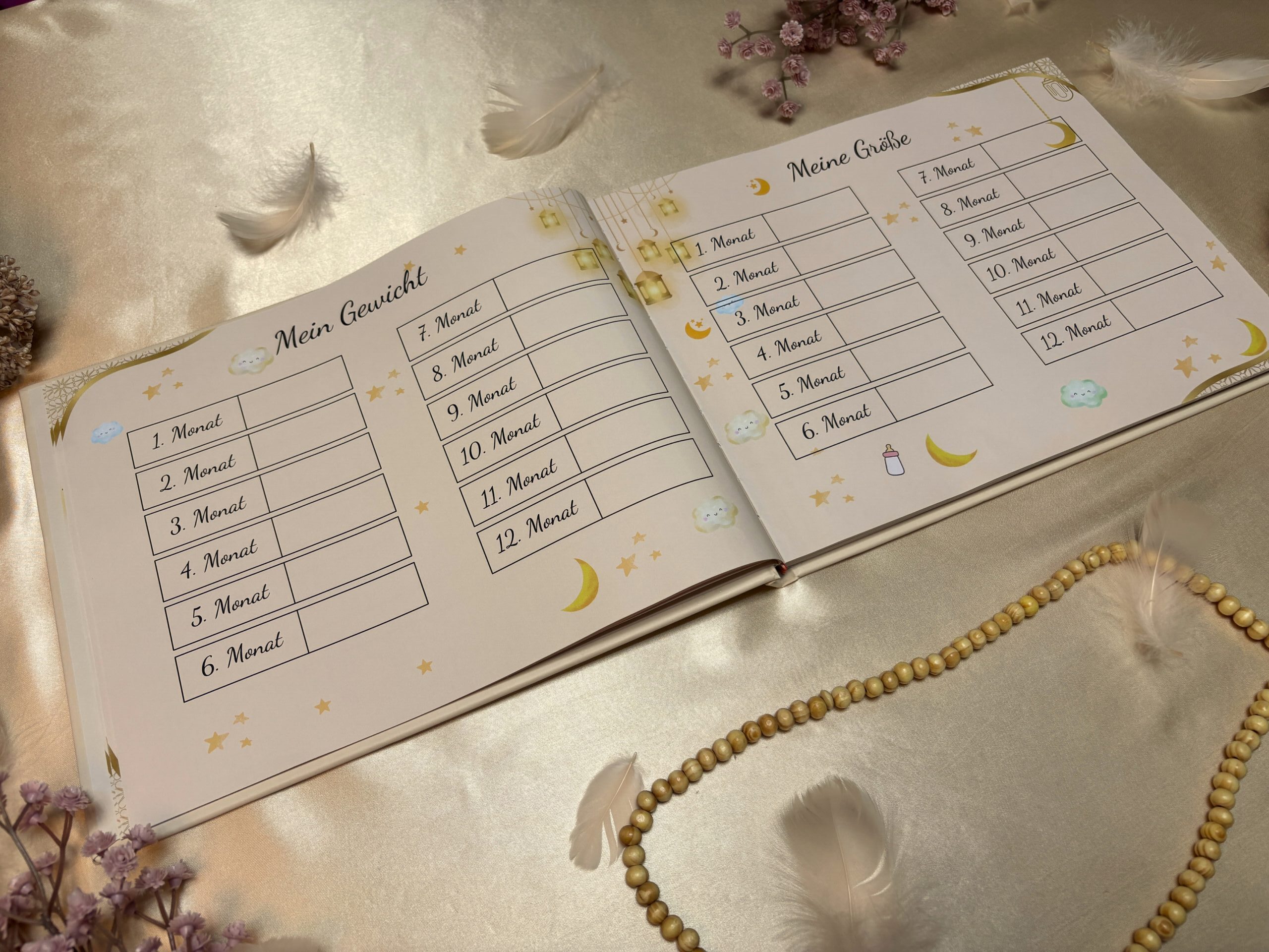 Ein besonderes Babyalbum im islamischen Stil, das die ersten Meilensteine, religiösen Anlässe und persönlichen Erinnerungen eures Kindes bewahrt. Ein Buch für die Zukunft – mit Liebe und Bedeutung gestaltet.