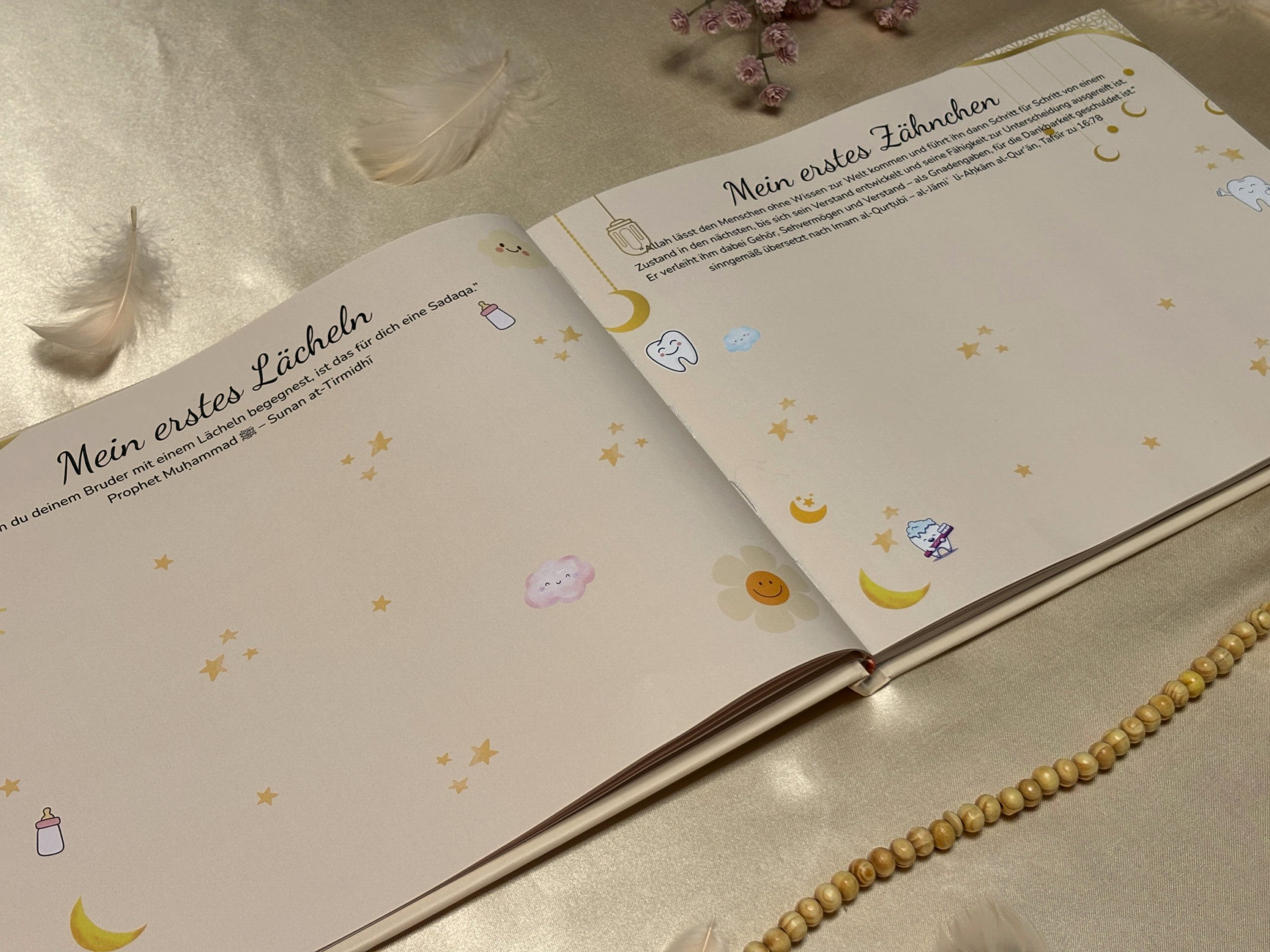 Das Buch begleitet euer Kind von den ersten Tagen an: mit Seiten zum Festhalten von Gewicht und Größe, einem Familienstammbaum, dem ersten Tag zuhause, dem ersten Lächeln, den ersten Krabbel- und Laufversuchen bis hin zum ersten Ramadan, dem ersten ʿĪd und dem ersten Geburtstag. Abgerundet wird das Album durch eine persönliche Duʿāʾ von Mama und Papa.